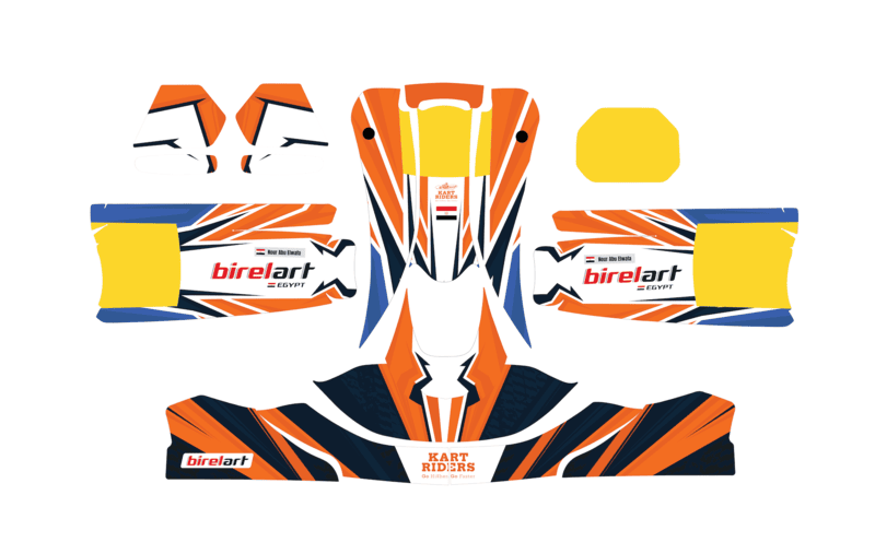 Official Kart Riders custom kart graphics kit in Blue & Orange design. Made from high-quality adhesive vinyl, designed for durability and a professional racing look. Perfect fit for competitive karting, with Kart Riders branding and bold color accents. Includes complete body kit decals for front, side, and rear panels.